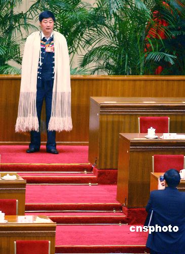 三月九日,十届全国人大四次会议第二次全体大会在北京人民大会堂举行,一位少数民族代表于大会结束后在主席台留影。作者:盛佳鹏