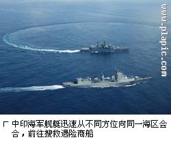 这天上午11时,根据联合国海事组织的通报,F 国一艘商船起火,请求救援。航行在印度洋的中国海军出访编队和印度海军“戈马蒂”号导弹护卫舰、“沙达”号近海巡逻舰,迅速从不同海区会合,前往搜救失火商船。随着两国海军编队指挥员“开始联合搜救”的命令,两国军舰迅速展开人道主义救援行动。