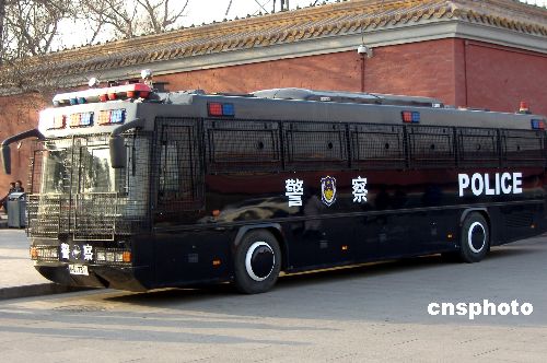 2006年3月13日,正值两会期间。新型公安特种防暴车在北京天安门前待命。作者:落扬