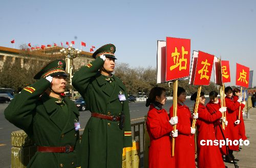 三月十三日,全国政协十届四次会议在北京人民大会堂闭幕,为两会服务的武警士兵和礼仪小姐在天安门广场问政协委员致敬。作者:盛佳鹏