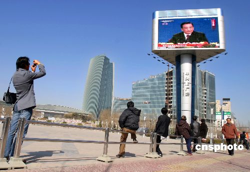 3月14日上午,北京路人在街头大型电视屏幕前驻足观看温家宝总理正在举行的记者会。当天上午中国十届人大四次会议闭幕后,中国总理温家宝在北京人民大会堂举行记者招待会阐述中国的内外政策,受到北京市民的关注。北京许多公众场所的电视进行了直播,中关村广场蓝天下的大彩屏吸引过往行人。作者:廖攀