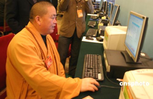 十四日上午,十届全国人大代表、嵩山少林寺方丈释永信出席十届人大四次会议闭幕式间隙,利用大会堂内的电脑上网查阅信息。作者:史宝银