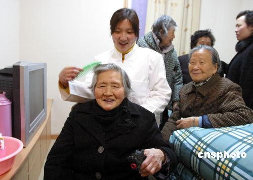 2006年3月15日下午,年过八旬的退休职工方佩珠(左一)入住江苏泰州退休人员公寓。当天,该公寓正式开放,主楼四层,建筑面积约2000平方米,首批20多名退休人员正式入住。据了解,这是全国劳动保障系统兴办的第一家老年公寓。作者:纯泉