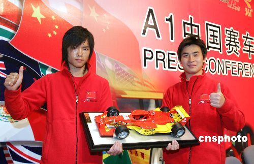 三月十六日,由车手江腾一(图右)和马青骅(图左)组成的A1中国国家队在上海亮相。首次在中国举行的A1世界杯汽车大奖赛中国总决赛,将于三月底在上海国际赛车场开幕。作者:汤彦俊