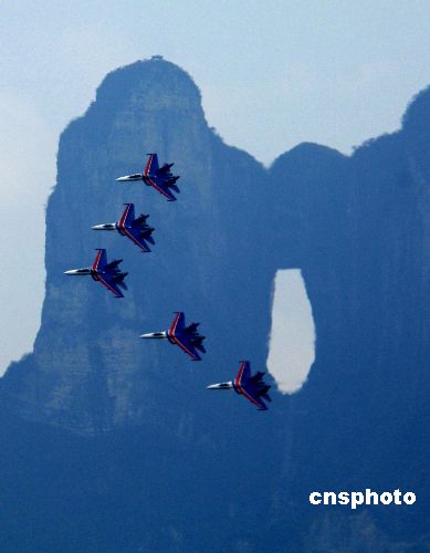 三月十六日,中国著名景区张家界的上空晴空万里,俄罗斯空军“勇士”飞行表演队苏—27战机在此进行特技飞行表演试飞行。未来几天苏—27究竟穿不穿天门洞的悬念未解,当机群不时从天门洞旁飞过时,现场所有的人不由睁大了眼睛。作者:王丽南