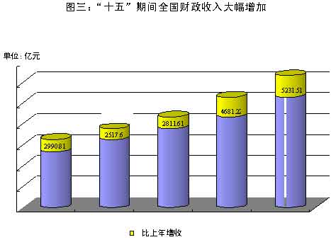 2005年是“十五”计划的最后一年。回顾过去的五年,国家财政面貌发生了新的变化,主要是:国家财政实力不断壮大。全国财政收入连续突破2万亿元、2.5万亿元和3万亿元大关。“十五”时期全国财政收入为11.5万亿元,比“九五”时期增加6.4万亿元,增长126.5%,其中中央财政本级收入增长141.5%,地方财政本级收入增长111.3%。“十五”末2005年全国财政收入占GDP比重为17.3%,比“九五”末2000年的13.5%上升了3.8个百分点。全国财政支出为12.8万亿元,比“九五”时期增加7.1万亿元,增长124%,其中中央财政本级支出增长109.5%,地方财政本级支出增长130.5%。财政收入增长的稳定性和协调性进一步增强,财政发展的步伐不断加快。财政宏观调控作用不断增强。根据经济发展的客观需要,相机调整并顺利实现了积极财政政策向稳健财政政策的转变,促进了经济保持平稳较快发展。在认真总结财政政策实践的基础上,建立健全了基本适应通货膨胀、通货紧缩、供求总量基本平衡但结构不均衡等不同经济运行形态需要的,包括目标定位、政策组合、时机选择、组织实施等一系列要素在内的财政宏观调控体系。以人为本的公共支出体系不断完善。按照科学发展观和社会主义市场经济发展的要求,大力调整和优化支出结构,不断减少并逐步退出对一般竞争性、经营性领域的财政投入;大力支持义务教育、就业和社会保障、公共卫生等公益性社会事业的改革和发展;向困难地区、行业和群众倾斜,注意解决事关人民群众切身利益的突出矛盾和问题,把实现好、维护好、发展好最广大人民群众的根本利益作为财政支出的出发点和落脚点。公共财政管理体制改革不断深化。积极推进出口退税机制改革、增值税转型、个人所得税及所得税收入分享改革,深化预算管理制度改革,支持其他方面经济体制改革;推动财政法制建设、加强会计基础工作、转变财政监督方式,进一步健全了公共财政管理框架。