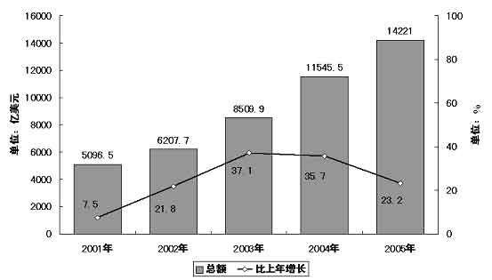 图表五 “十五”期间外贸进出口总额及其增长情况
