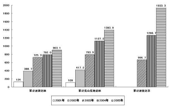 “三河三湖”、三峡库区、南水北调工程沿线等重点流域区域水污染防治工作步伐加快,城镇污水、工业废水、危险废物、火电厂二氧化硫污染治理进一步加强。城市污水处理率和工业固体废物综合利用率继续提高。部分空气污染严重城市的空气质量有所改善。退耕还林完成111.1万公顷,荒山荒地造林及封山育林266.7万公顷,退牧还草666.7万公顷。天然林资源保护、京津风沙源治理等重点生态建设工程进展顺利。“三化”草地治理、水土流失治理和矿山生态恢复面积分别为838万公顷、420万公顷和7.2万公顷。野生动植物资源保护得到加强。