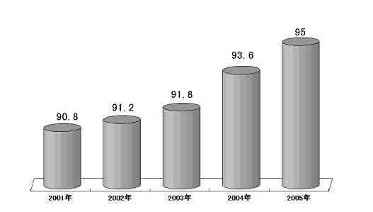 图表七 “十五”期间全国义务教育人口覆盖率 (单位:%)