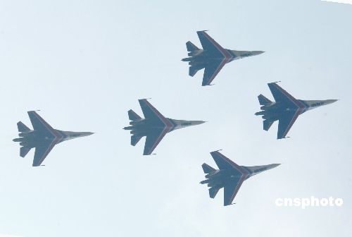 三月十七日是俄罗斯空军张家界天门山特技飞行表演的第一天。俄罗斯空军“勇士”飞行表演队按计划进行各种特技动作表演。图为五架苏-27战机成菱形列队翻转飞行表演。据介绍,这些特技动作都在飞行速度800-900公里/小时、低空高度60-150米的状态下完成。作者:王丽南