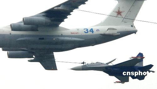 三月十八日,张家界上空,俄罗斯试飞院苏-30战机和伊尔-78加油机表演空中加油。张家界上空能见度很低,他们在高空、高速情况下完成汇合、对接等数个高技术含量动作。作者:王丽南