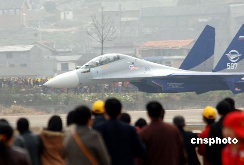 图:苏-30战机特技表演超低空飞行几乎擦地