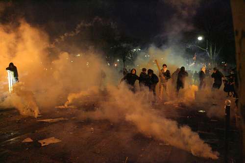一些学生高喊“解放索邦”、“到处是警察,就是不见公理”的口号,有人情绪激昂,还把警方摆放的路障搬走,甚至还向一辆防暴警察的货车丢汽油弹,导致货车著火。