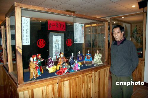 台湾著名布袋戏艺术家李传灿在其父李天禄的布袋戏文物馆。图为李天禄生前表演的布袋戏《乾隆游西湖》片段。作者:陈立宇