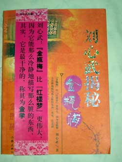 这本名为《刘心武揭秘〈金瓶梅〉》的图书,封面模仿东方出版社的《刘心武揭秘〈红楼梦〉》,称是作家出版社2006年3月第一版,定价28.8元。封面环套上非常醒目地写着宣传语:“刘心武:《金瓶梅》比《红楼梦》更伟大,因为它能那么冷静地描写那么×的东西,其实,它是最干净的,称其为金学。”