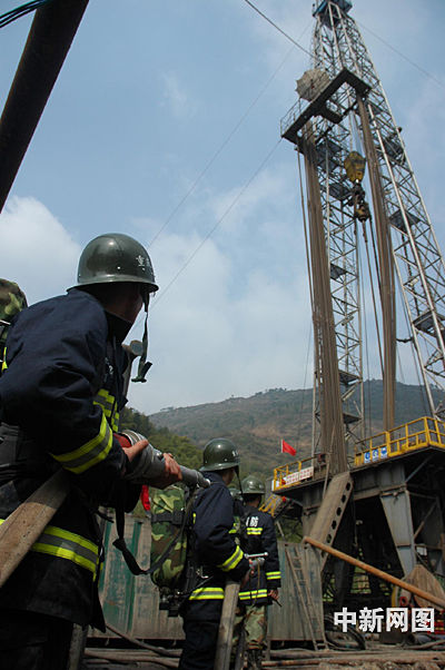 图为重庆消防官兵为压井做紧张的准备。陈诚