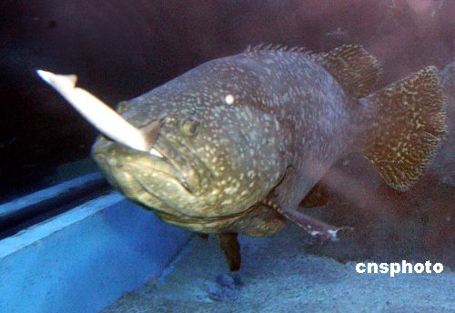 3月29日下午5时许,福州市左海公园海底世界刚从海南购进的三只白鳍鲨中,有一只1米长的白鳍鲨被一条巨石斑鱼生生地吞吃了。当记者赶到水族馆时,透过巨大的玻璃窗只见这条长约1.8米的巨石斑鱼正“大腹便便”地缓慢游动着,满脸凶相,嘴边还剩下那只被生吞下的白鳍鲨的尾鳍,而其它鱼儿们早就吓得不见了踪影。作者:杨婀娜