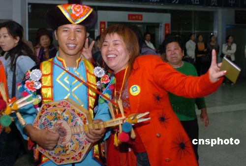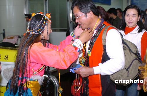 三月三十日,由八十五人组成的台湾少数民族代表团抵达昆明,参加第三届海峡两岸少数民族发展研讨会。图为台湾少数民族代表团一名女成员在昆明机场与前来迎接的云南彝族小伙合影。作者:王林