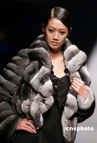 “应大”二零零六/二零零七中国皮装流行趋势发布四月一日晚在中国国际时装周上举行,图为著名模特贾妮妮展示一款具有怀旧风格的时装。 作者:毛建军