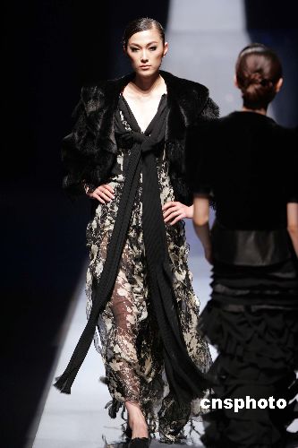 “应大”二零零六/二零零七中国皮装流行趋势发布四月一日晚在中国国际时装周上举行,著名模特戴小奕展示设计简洁、具有怀旧风格的皮装。作者:毛建军