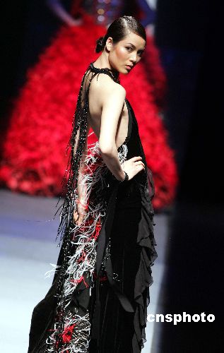 “应大”二零零六/二零零七中国皮装流行趋势发布会四月一日晚在中国国际时装周上举行,著名模特王敏展示一款时装。作者:毛建军