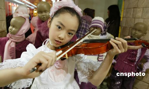 一位身着公主裙的小模特在现场演奏乐曲招揽参观者目光。作者:任海霞