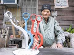 最近杨宗明到外甥经营的汽车修理厂,看到大堆废弃零件,灵光一闪就拿了一些回家试着创作。不管排气管、轮胎钢圈、方向盘等,经过杨宗明的巧手慧思,都成了一件件动人的装置艺术品。