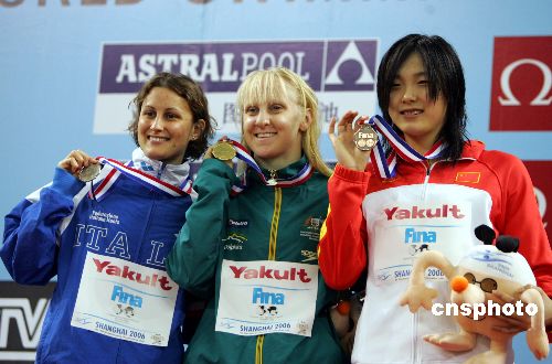 四月五日,第八届世界短池游泳锦标赛在上海拉开战幕,在首日进行的女子二百米蝶泳比赛中,中国选手杨雨(图右)以二分零七秒零五的成绩夺得铜牌。澳大利亚名将“蝶泳女皇”施佩尔(图中)获得金牌、意大利选手萨加特(图左)获得银牌。作者:汤彦俊