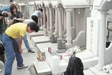 中新网4月6日电 清明时节,不但有大批孝子贤孙到坟场拜祭亲人,更有不少影迷歌迷拜祭偶像。据香港媒体报道,一如往年,已故影艺界名人黄家驹、陈百强坟前摆放不少鲜花祭品,一大清早,一名男歌迷到黄家驹坟前致祭,他更带备有关Beyond的书籍悼念家驹,除了鲜花外,更送上两罐可乐供奉。