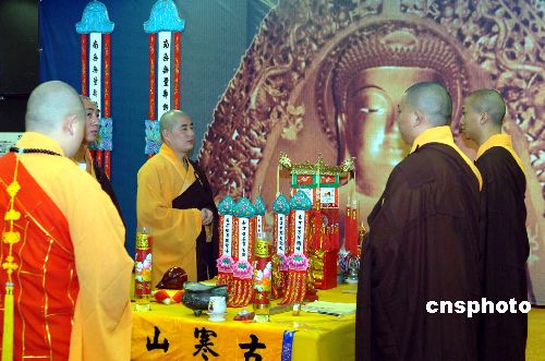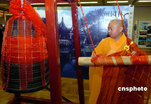 4月8日,汇集著名的苏州寒山寺文化精华的寒山寺展在东京开始举行。寒山寺僧人在开幕式上撞响吉祥钟声。