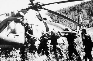 由于山高林密,运兵车不能到达火场。按照预先号令,前指指挥员下达了第一道作战命令:“索降中队第一梯队执行开辟机降场地命令,立即出发!”只见7名索降队员,带上特种装具,乘机迅速到达离火线只有100米左右的地方。火场上空到处都是浓烟,队员很快索降到地面,仅用20分钟,就用油锯、割灌机、斧头,开辟了一个60×80平方米的机降场地。紧接着,数架直升机轮番运送扑火队员降落。