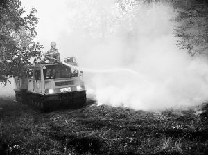 此时,地表火还在燃烧,装甲运兵车立即出动。铁骑滚滚,所到之处,火魔“哀鸣”。灭火水炮向地下火发出灭火水弹,地下火瞬间熄灭。清理中,马甲式、囊式、背负式水枪并用。数百公顷的森林大火,不到半天时间就被彻底扑灭。