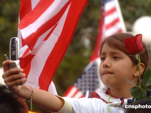 一位拉丁裔小姑娘用手机拍摄父辈大游行壮观场面。作者:贾国荣