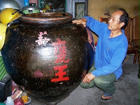 曾景生说,这个大瓮是腌菜容器,因为体积大所以是在窑里捏制上釉后烧坯的;7年前,他出差到新竹,在新埔客家庄里见到它时惊为天物,知道物主有意脱售后,回到台东,未征询妻子同意就领出当年的年终奖金12万元新台币买下这个大瓮。老婆为这个瓮与他冷战过一段时间,亲友知道也说他“疯了”。
