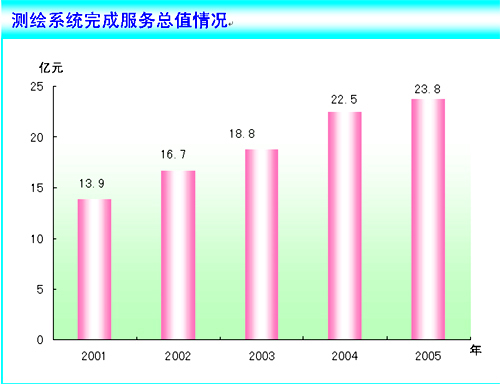 23.8亿元,向社会提供各类地形图约61.9万张、数字地图约12.6万幅,大地成果8.6万点、航摄成果约57.4万片。编制出版行政区划、教学、旅游等地图、图书2164种,总印数1.7亿册(幅)。组织开发了一批供政府和有关部门科学决策所急需的地图和基于地理信息的管理系统,为国家和地方重大工程建设提供了测绘保障。 测绘法律体系进一步完善。河北、吉林、江苏、浙江、江西、山东、重庆、四川、贵州、云南、青海等省(区、市)修订出台了测绘管理条例(办法)。在2002年《中华人民共和国测绘法》修订后,完成地方测绘管理条例(办法)修订的省(区、市)达到23个。