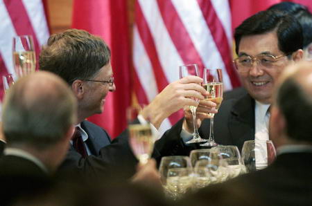 中新网4月19日电 据路透社报道,中国国家主席胡锦涛于西雅图时间19日晚参加了在微软总裁比尔·盖茨家举行的晚宴。华盛顿州州长葛瑞格尔代表600万人民热烈欢迎胡锦涛的来访。(固山)