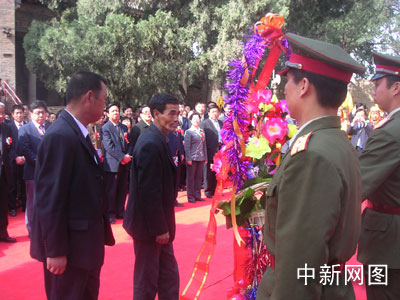 图:仓颉的出生地和守陵人代表向仓颉献花篮