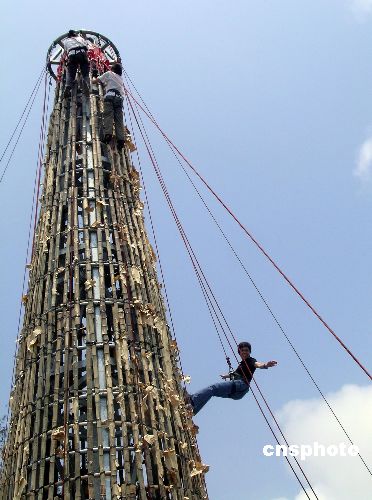 抢包山是香港长洲一年一度的一项特色传统民间活动,但自从1978年发生包山倒塌意外造成多人受伤后,便一直被禁止举行,直至2005年才获香港政府批准重办。为推广去年始复办的长洲“抢包山”活动,并使“抢包山”活动能在安全的情况下进行,4月23日举办单位于长洲北帝庙游乐场进行“攀包山训练”,虽然天气炎热,但报名参赛的健儿仍轻松的完成训练。作者:蔡蔓莉