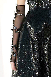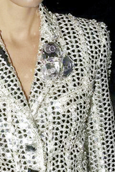 香奈尔(Channel)展示的闪片小西装也让人叫绝。摈弃闪片几十年惯用的圆形和前几季曾流行过的方形,采用独到的三角形银灰色闪片制作西装套装。三角的尖锐形状,银灰的高傲色调和亮片的耀眼锋芒,无一不透露出Channel小西装的清冽气质。设计师在西装的设计上,采用今季流行的小翻领样式,并饰以同色系亮片缝制的三朵小花,为整体感觉比较冷艳硬朗的小西装,增添了些许妩媚之气。