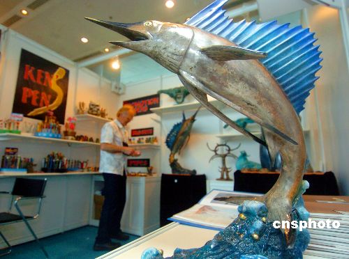 香港礼品及赠品展28日在会展中心揭幕﹐一家工艺品货架上的鲨鱼造型逼真。本届有来自35个国家及地区的3879家商家参展﹐贸发局组织了2800余家企业超过5000名重要买价光顾参观。据悉香港这项展览是亚洲最大﹑世界排名第二。作者:宋吉河