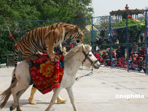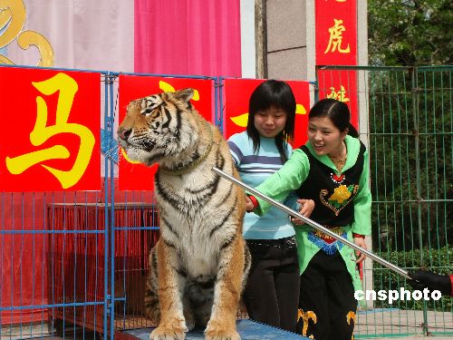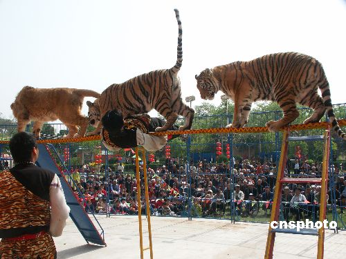 4月28日,来自安徽的马戏团在河南省开封市汴京公园里为人们试表演大型训兽节目,准备迎接“五一”旅游黄金周的到来。作者:凯枫