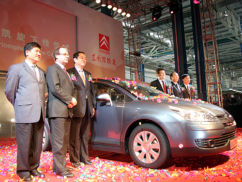 中新网武汉4月29日电 (郜威伟)日东风雪铁龙凯旋轿车下线仪式,4月28在神龙汽车有限公司武汉工厂举行。图为湖北省领导、东风汽车和法国PSA高层与新车合影。