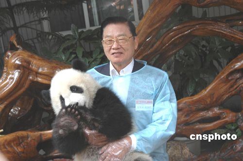 四月二十九日上午,由台湾中国信托金融控股公司董事长辜濂松任团长、中国国民党副主席江丙坤任顾问的“台湾工商界川渝经贸考察团”一行,在成都大熊猫繁育研究基地参观并与大熊猫亲密接触。江丙坤怀抱大熊猫“晶晶”留影。大熊猫“晶晶”于去年8月30日出生,是北京奥运会吉祥物福娃“晶晶”的原型。作者:鲁彦