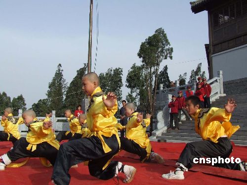 “五一”黄金周期间,水泊梁山风景区在完善传统表演项目基础上,将推出“威风锣鼓”表演和武术表演项目,以及“二人斗”、“梁山曲艺”等民间绝活,以武会天下游客,使海内外游客观赏领略中华习武文化。图为梁山武术学校的学生在忠义堂为游客进行武术表演。 作者:陈昌航