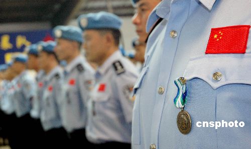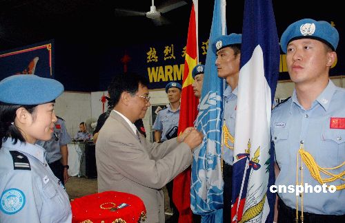 5月4日海地太子港消息:5月4日,中国第三支驻海地维和警察防暴队迎来了激动人心的时刻,今天他们在海地太子港营区接受联合国授予的“联合国和平勋章”,警察总监缪尔、副警察总监多米尼克,各国驻维和部队司令、维和防暴队队长等为中国第三支驻海地维和警察防暴队队员授勋,中国第三支驻海地维和警察防暴队125名队员全部来自山东省各级公安机关。
