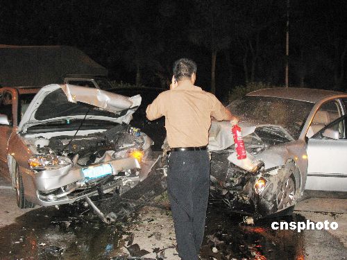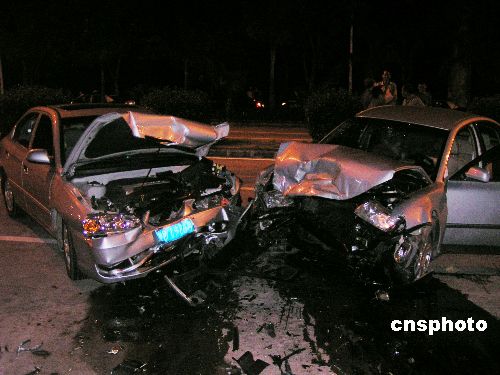 5月4日,广东省湛江市一辆帕萨特小轿车与一辆同向行驶的摩托车相撞后,又向左前方飞越路中隔离绿化带,铲倒一丛灌木,与迎面开来的一辆小轿车相撞,两轿车车头损毁严重,造成一死4伤。交警部门提醒市民,严禁酒后驾车和超速行驶!节日出行,安全第一。作者:李满青