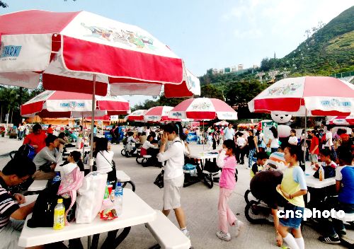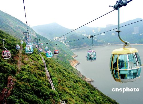 五日香港天晴高温 “五一黄金周”香港阴雨天气多﹐游客赶上晴天当然不会放过。海洋公园遮阳伞下的冷饮客位满座。香港公园一些游客乘坐缆车观光,另一些游客则在喷泉边休闲乘凉。