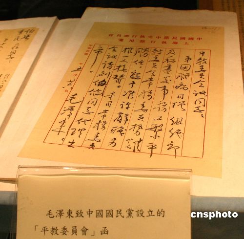 馆藏中,第一次及第二次国共合作期间的珍贵史料都很丰富。尤其是第一次国共合作中,共产党员以个人身份加入了国民党,因此很多早期共产党的创始人,如李大钊、陈独秀、毛泽东等人的亲笔文稿,都能在此找到。笔者最近即由国民党党史馆取得早年第一代共产党领袖的有关书信,这也是这批珍贵书信首次公之于世,对于反映当时的时代情境和当事人的个性特色颇为传神。其中毛泽东的书信有3封,都是他担任国民党要职时写给党中央的短笺。