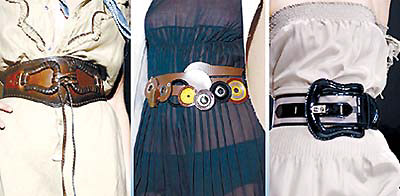 看过Fendi、Missoni、AlexanderMcQueen等品牌的春夏新装,你会发现阔别已久的宽大腰封重新进入流行视野,而在各种时尚场合,拥有敏锐的时尚触觉的女明星们也迫不及待地将宽大的腰带高高束起,以尽显美好身姿。如记者就亲见Fendi一款巨大搭扣的黑色漆皮宽腰带被众多港台女星轮番力撑。