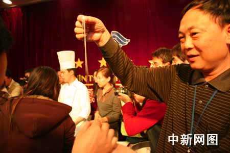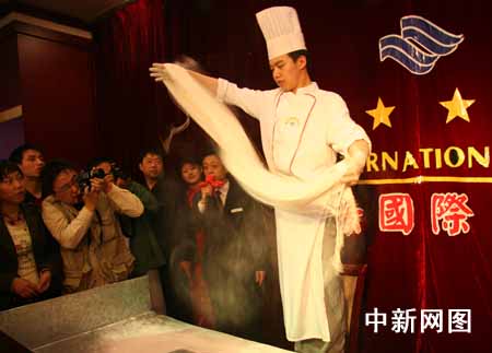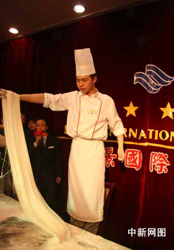 5月12日晚,山西省晋中市政府在该市颐景国际大酒店举办晚宴,款待首届“全国网络媒体山西行”代表团一行。席间,酒店的厨师为来客表演了头顶刀削面、剔尖、拉面等平日难得一见的绝活。
